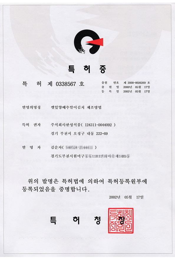 | 2 | 2002. 05. 17 | 0338567 | 깻잎양배추말이김치 제조방법 |