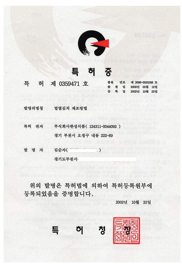 | 8 | 2002. 10. 22 | 0359471 | 얼열김치 제조방법 |