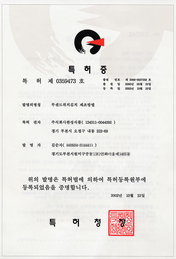| 10 | 2002. 10. 22 | 0359473 | 무샌드위치김치 제조방법 |