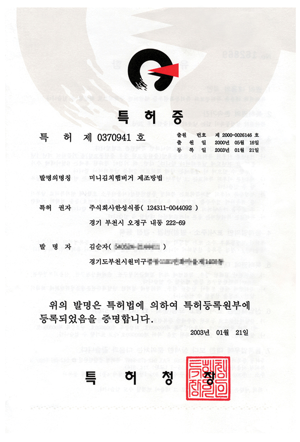 | 11 | 2003. 01. 21 | 0370941 | 미니 김치햄버거 제조방법 |