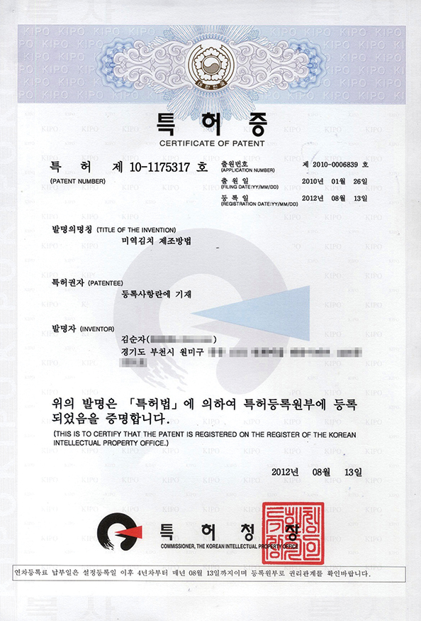 | 20 | 2012. 08. 13 | 10-1175317 | 미역김치 제조방법 |