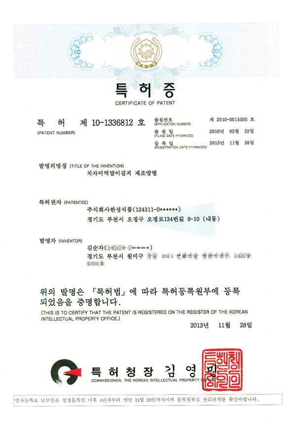 | 21 | 2013. 11. 28 | 10-1336812 | 치자미역김치 제조방법 |