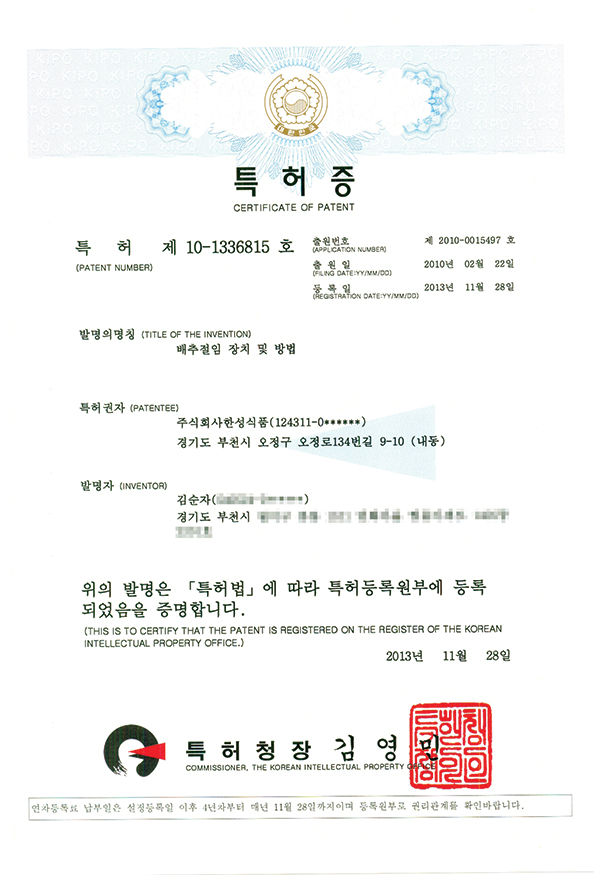 | 번호 | 특허일자 | 특허번호 | 특허명칭 |