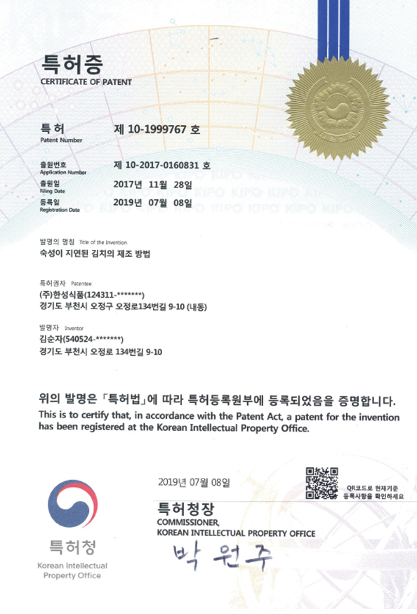 | 27 | 2019. 07. 08 | 10-1999767 | 숙성이 지연된 김치의 제조 방법 |